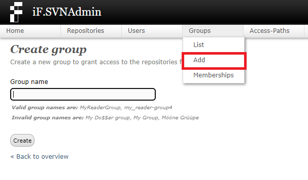 1. 상위 메뉴의 Groups -> Add를 누른 뒤 그룹명을 입력하여 생성합니다.
