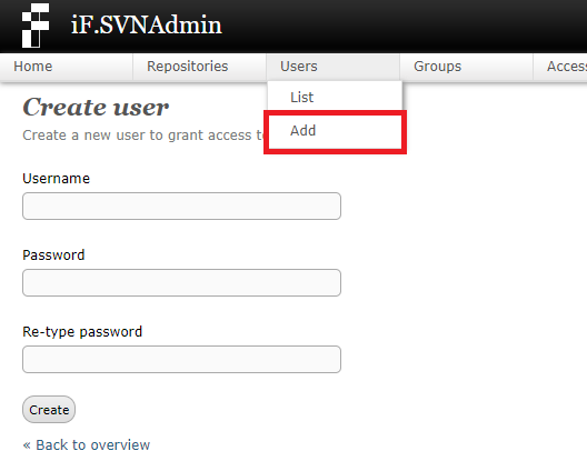 1. 상위 메뉴의 Users -> Add를 누은 뒤 Username(유저ID)와 password(비밀번호)를 입력하여 생성합니다.