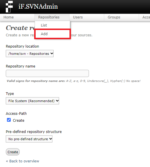 1. 상위 메뉴의 Repositories -> Add를 누른 뒤 Repository name(저장소 이름)을 입력하여 생성합니다.