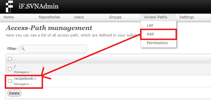 1. 권한 부여를 위해 상위 메뉴의 Access-Paths -> List를 누른 뒤 나오는 저장소 목록에서 권한 부여를 할 저장소를 선택합니다.