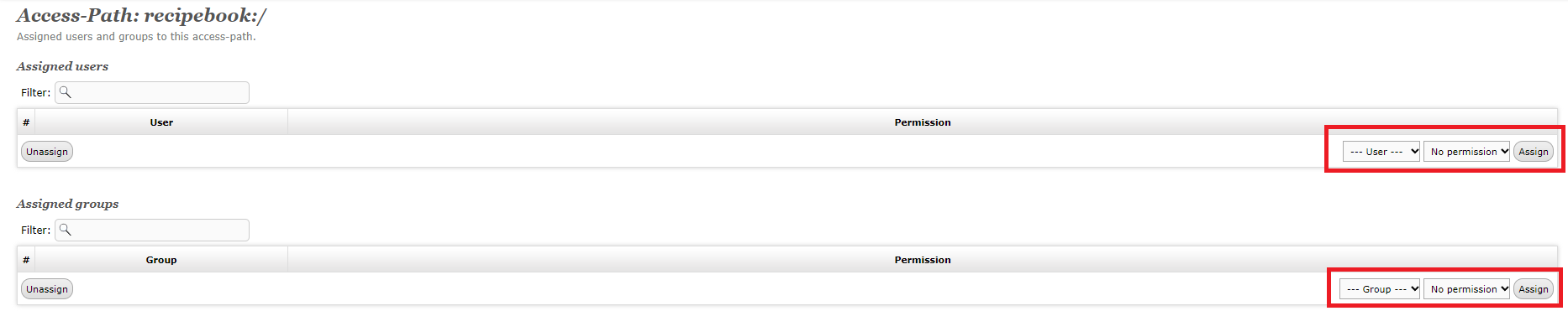2. 권한 부여를 할 유저 또는 그룹을 선택하고 권한을 선택한 뒤 Assign을 눌러 권한을 부여합니다.